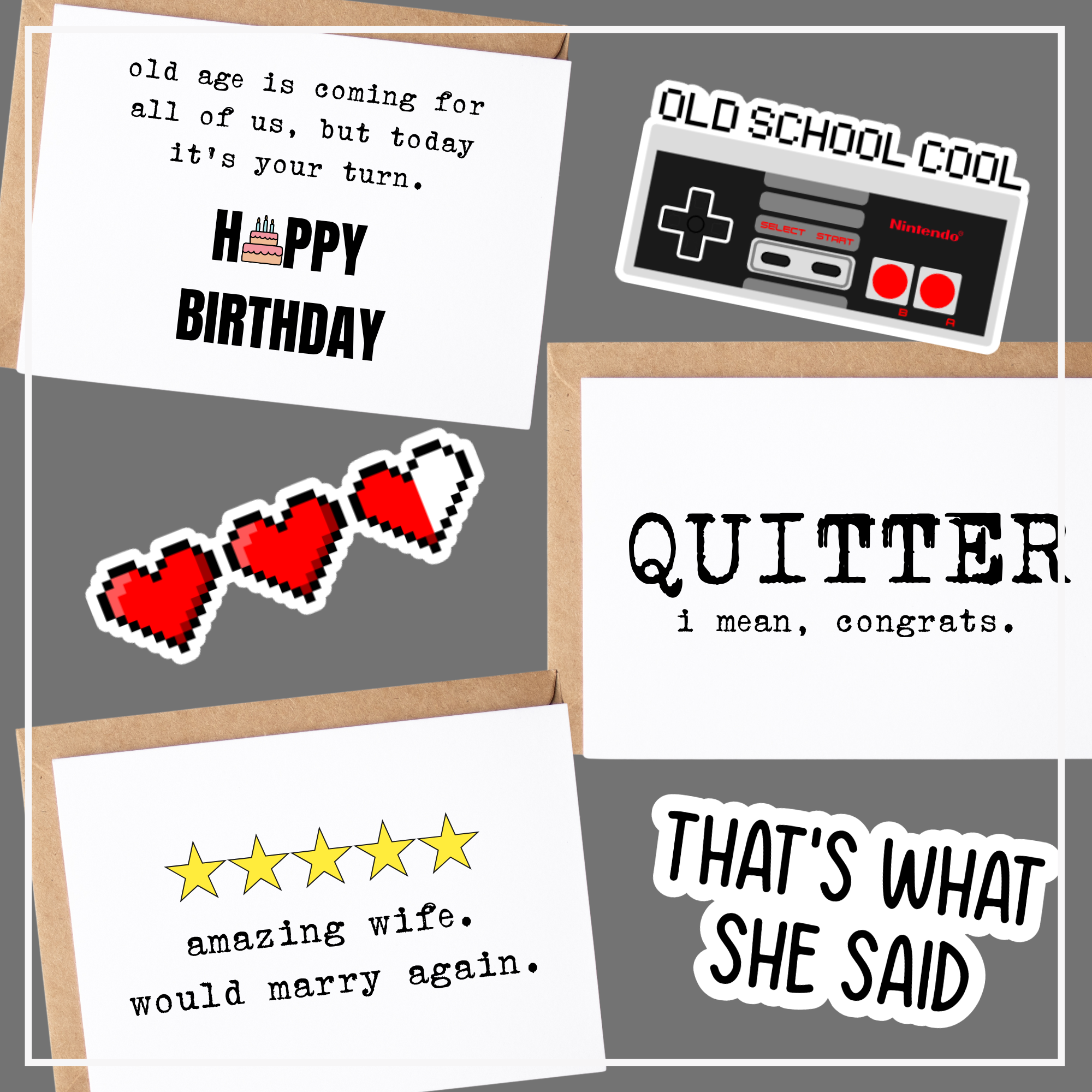 Our products are unapologetically sassy, snarky & sarcastic. If you want something sentimental, go to Hallmark.