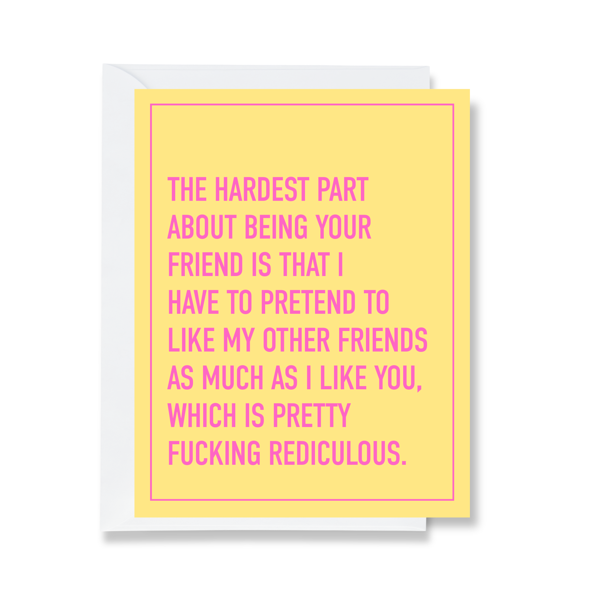 Card Text: THE HARDEST PART ABOUT BEING YOUR FRIEND IS THAT I HAVE TO PRETEND TO LIKE MY OTHER FRIENDS AS MUCH AS I LIKE YOU, WHICH IS PRETTY FUCKING REDICULOUS.