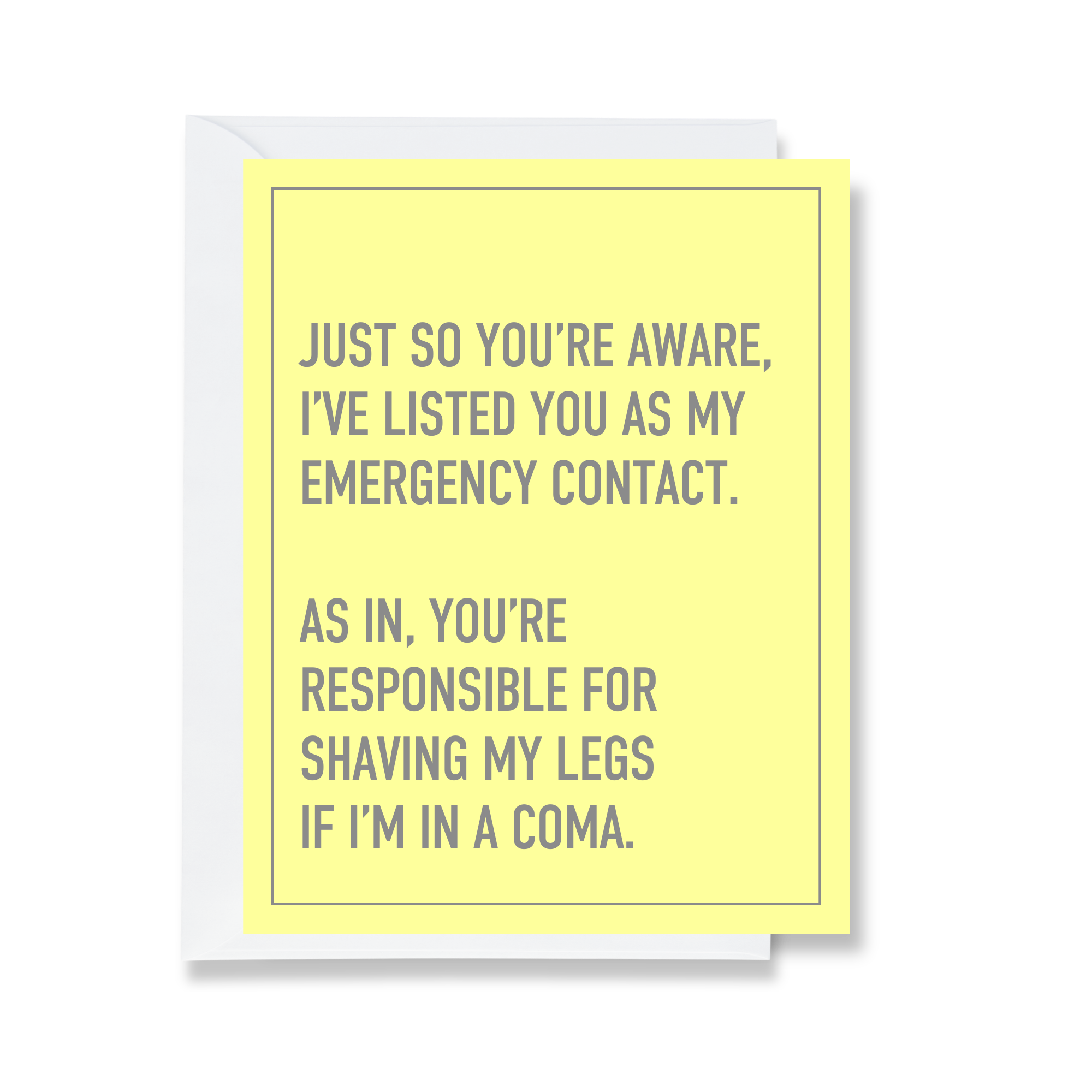 Card Text: just so you're aware, i've listed you as my emergency contact. as in, you're responsible for shaving my legs if i'm in a coma.