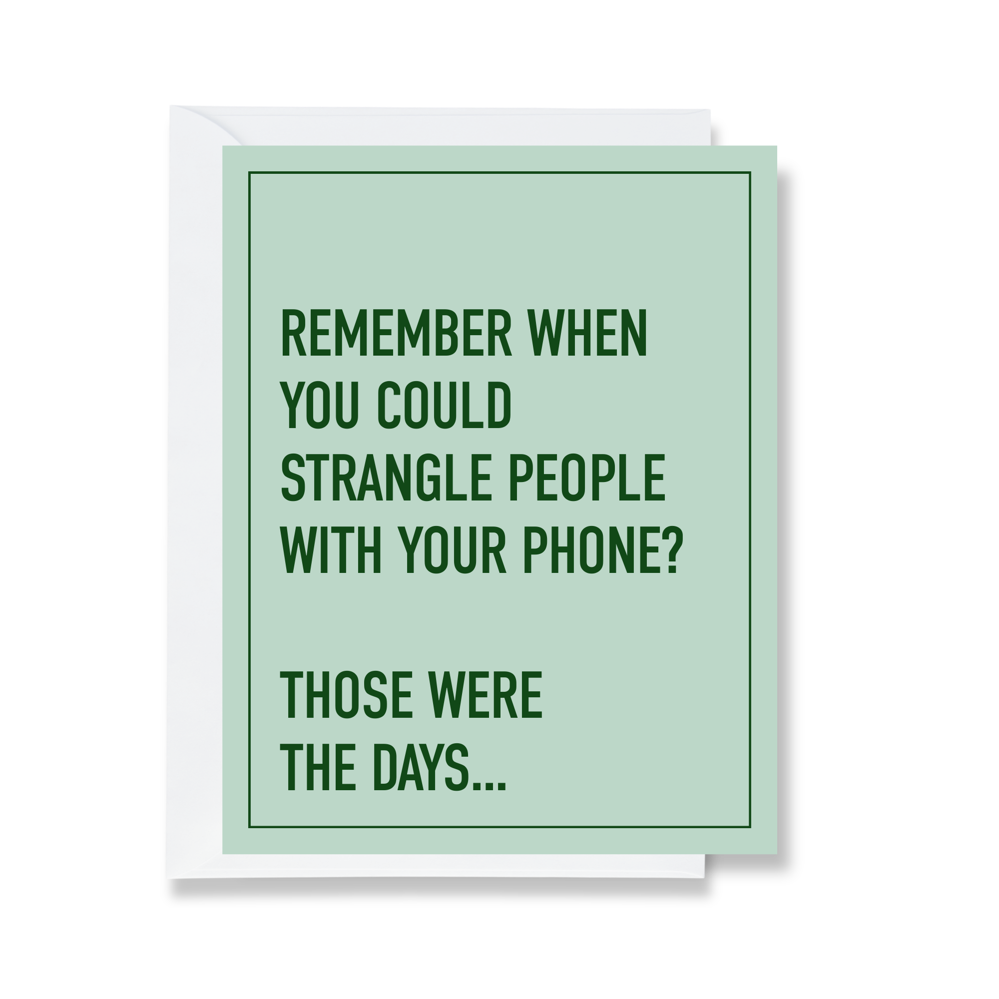 Card Text: REMEMBER WHEN YOU COULD STRANGLE PEOPLE WITH YOUR PHONE? THOSE WERE THE DAYS...