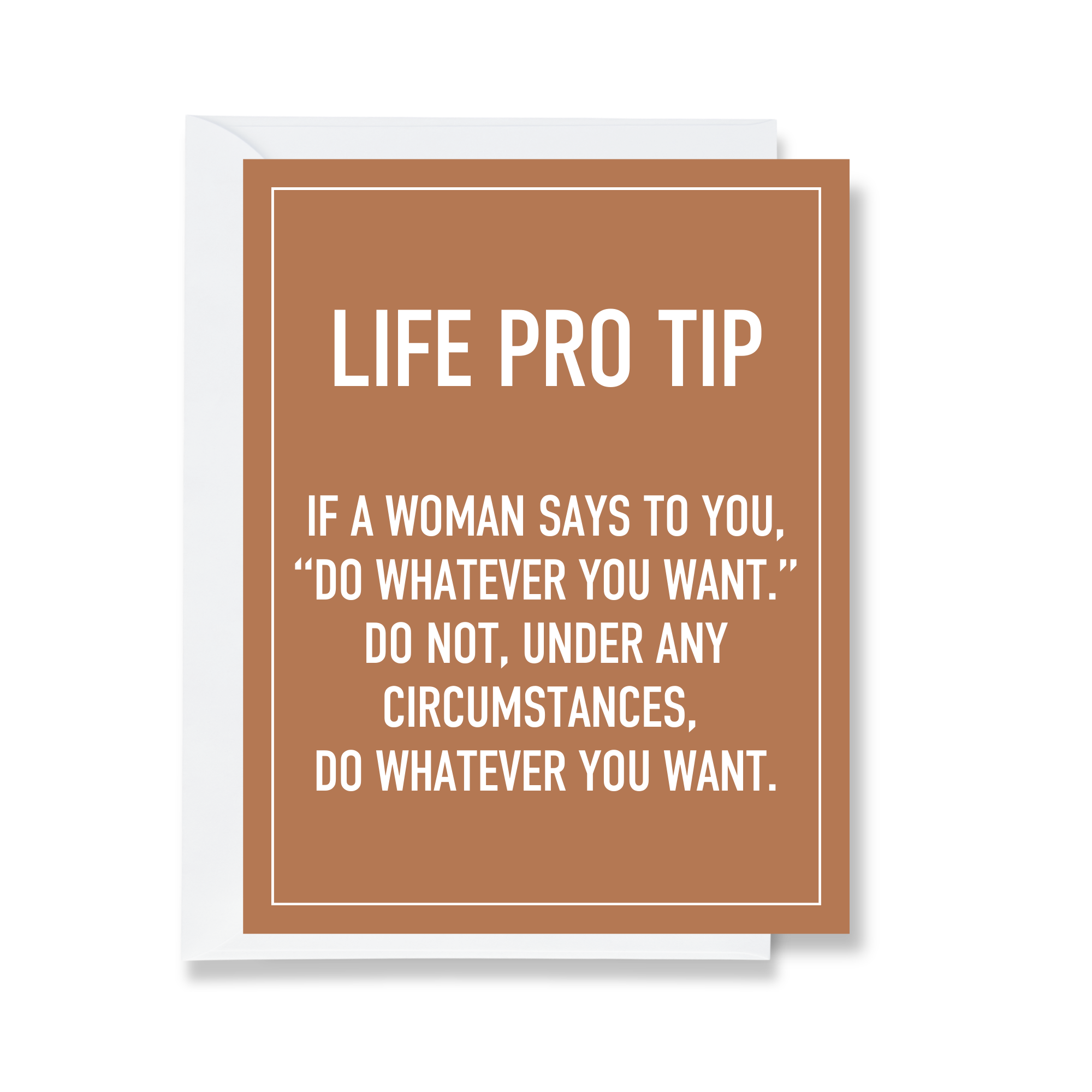 Card Text: LIFE PRO TIP - if a woman says to you, "do whatever you want." do not, under any circumstances, do whatever you want.