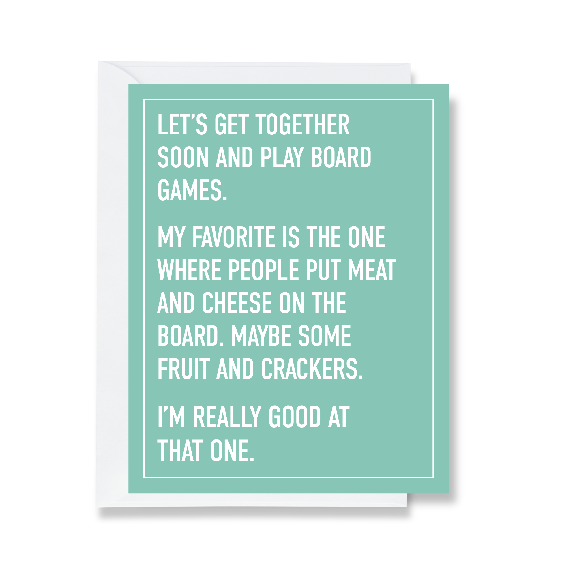 Card Text: let's get together soon and play board games. my favorite is the one where people put meat and cheese on the board. maybe some fruit and crackers. i'm really good at that one.