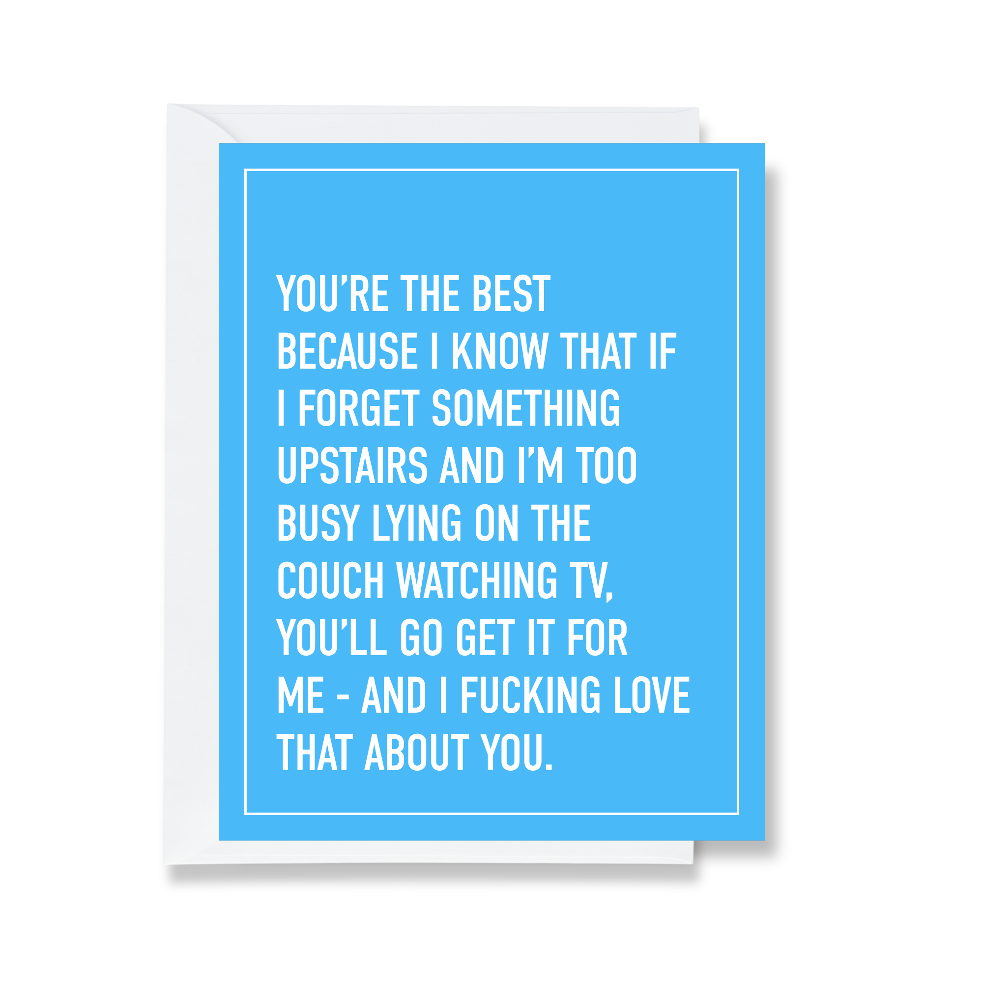 Card Text: you're the best because i know that if i forgot something upstairs and i'm too busy laying on the couch watching tv, you'll get get it for me, and i fucking love that about you.