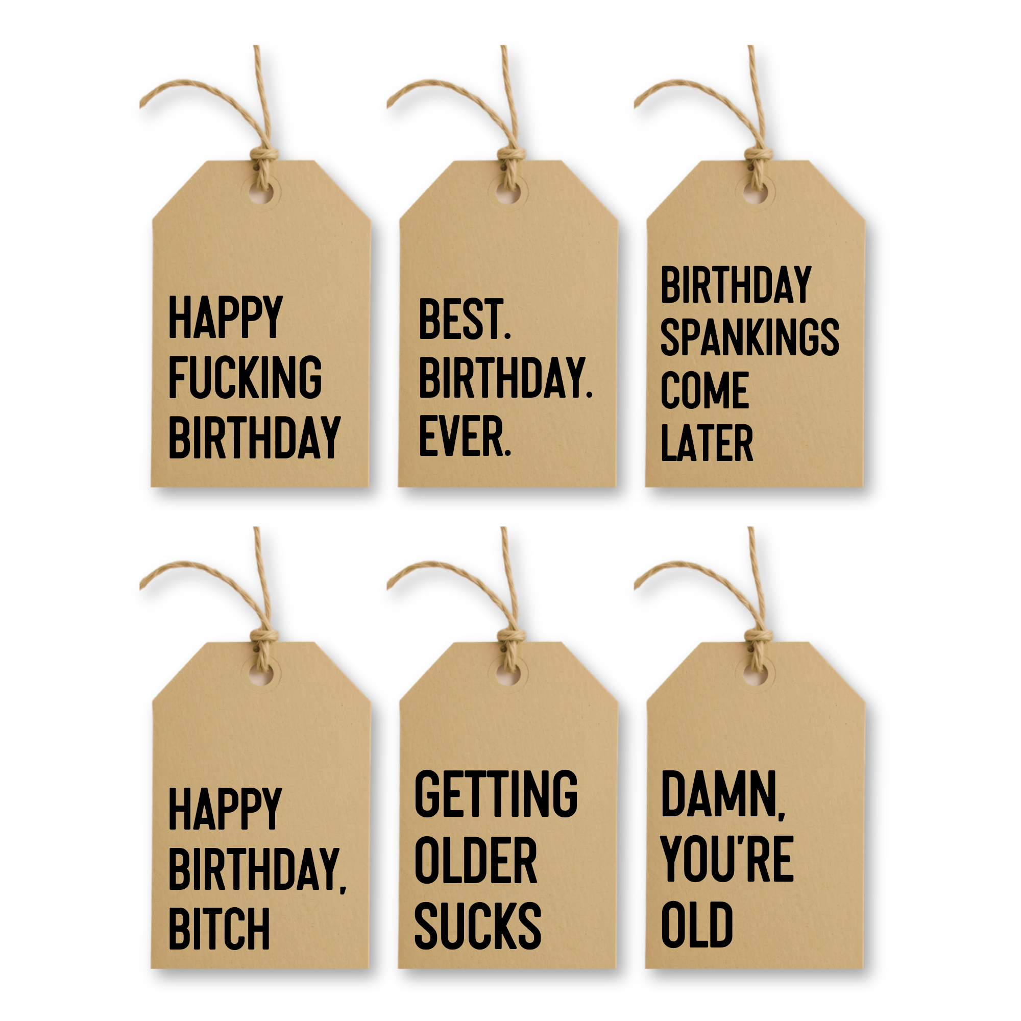 These kraft paper tags turn every birthday gift into a gift with attitude — perfect for those who express themselves via insults, but still like to show you care... barely.