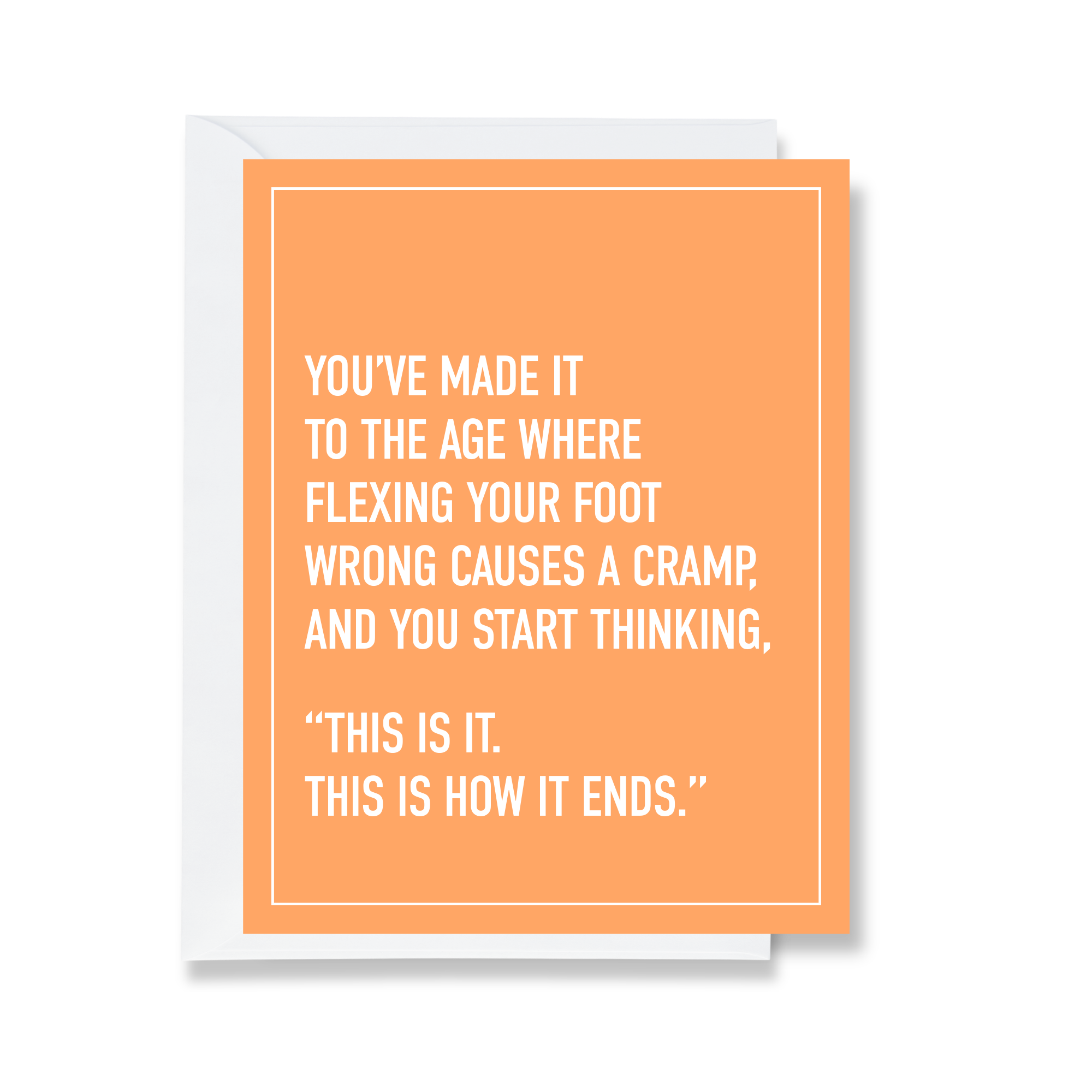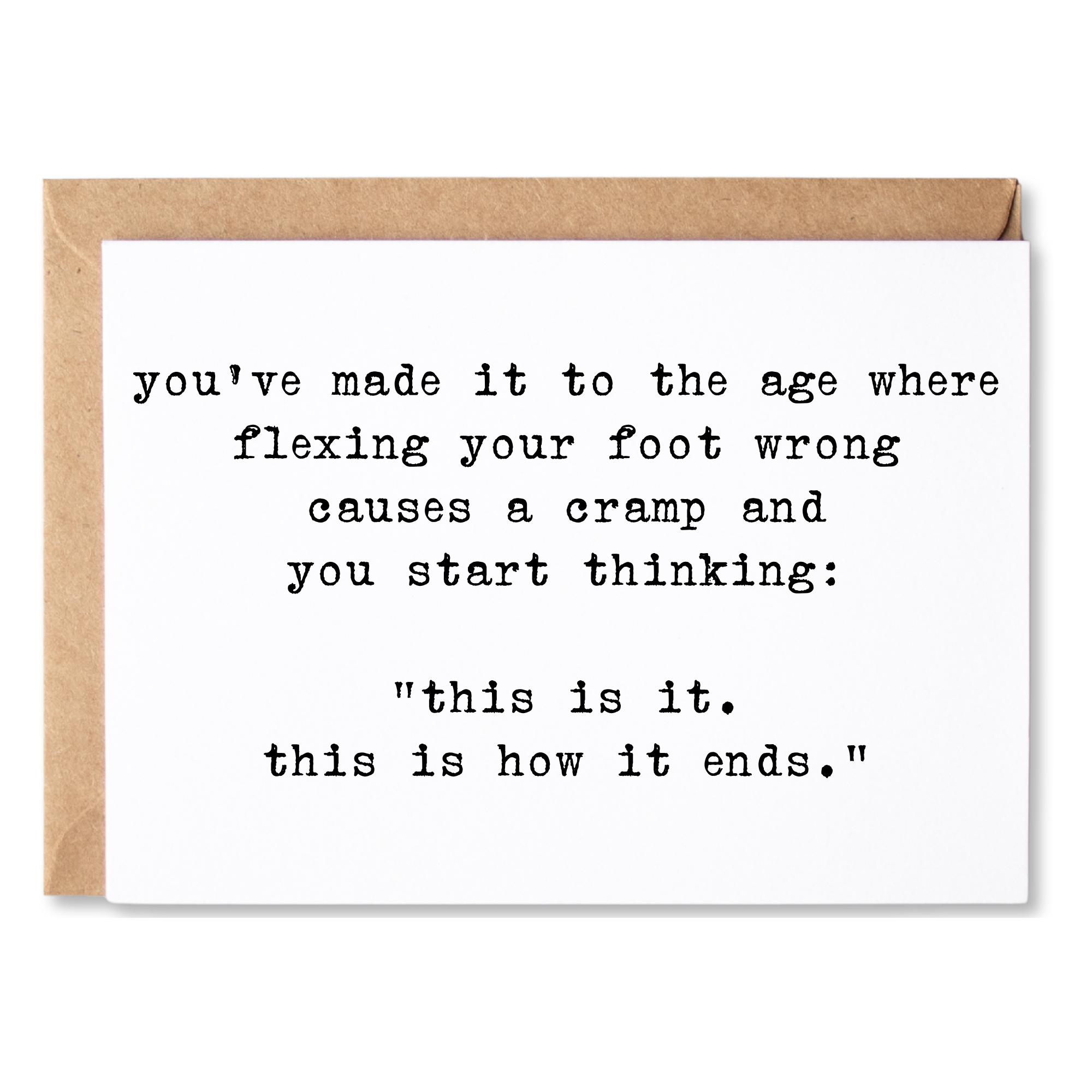 Card Text: you've made it to the age where flexing your foot wrong causes a cramp and you start thinking: "this is it. this is how it ends."