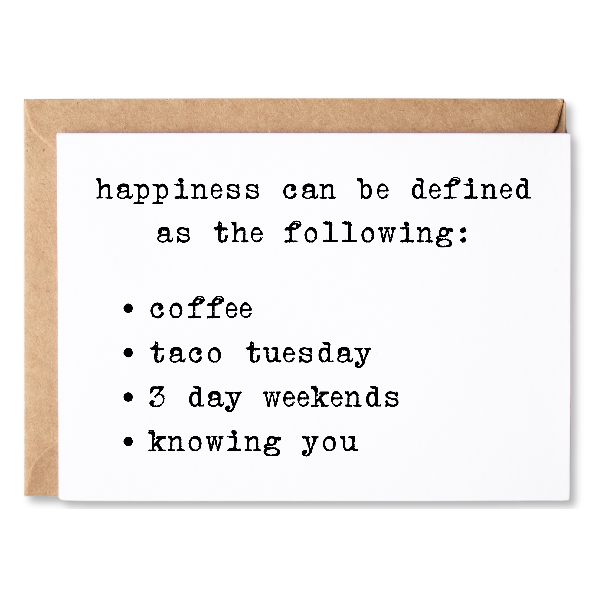 ✒️ message: happiness can be defined as the following: coffee, taco tuesday, 3 day weekends, knowing you