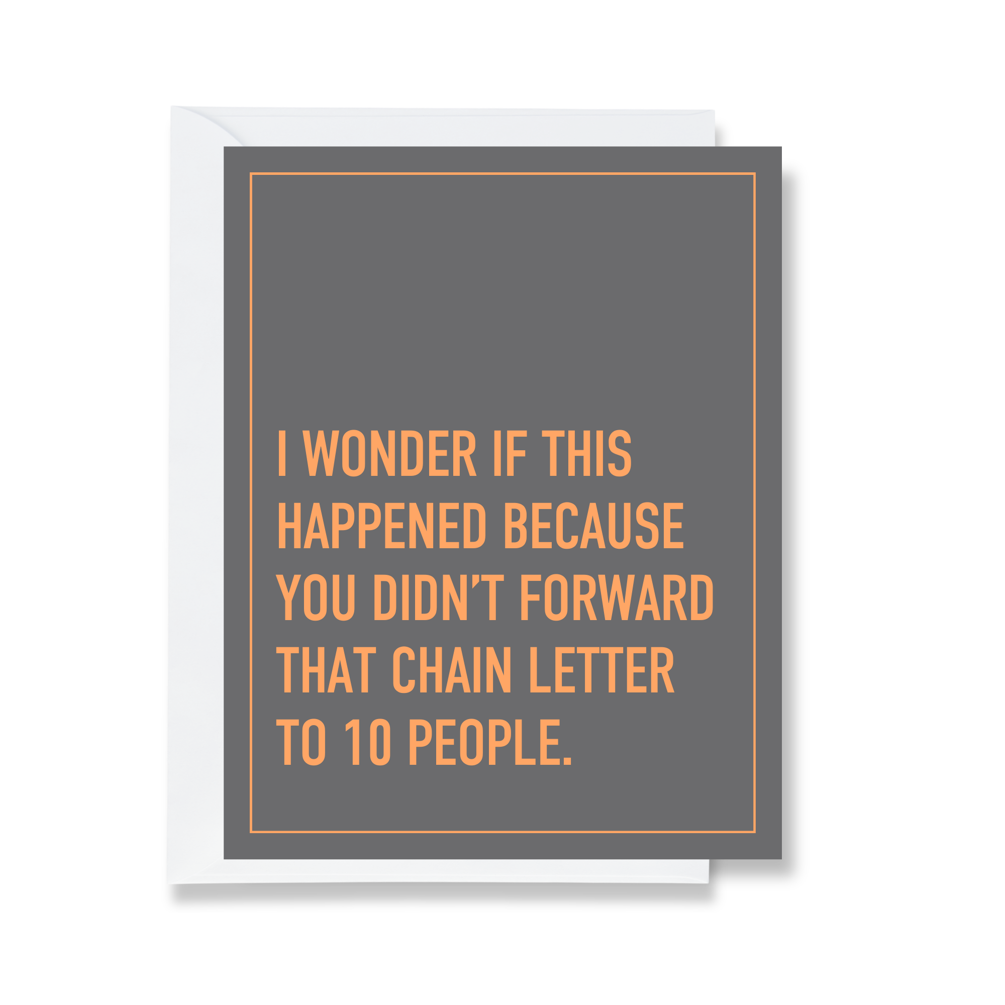 Card Text: I WONDER IF THIS HAPPENED BECAUSE YOU DIDN'T FORWARD THAT CHAIN LETTER TO 10 PEOPLE.