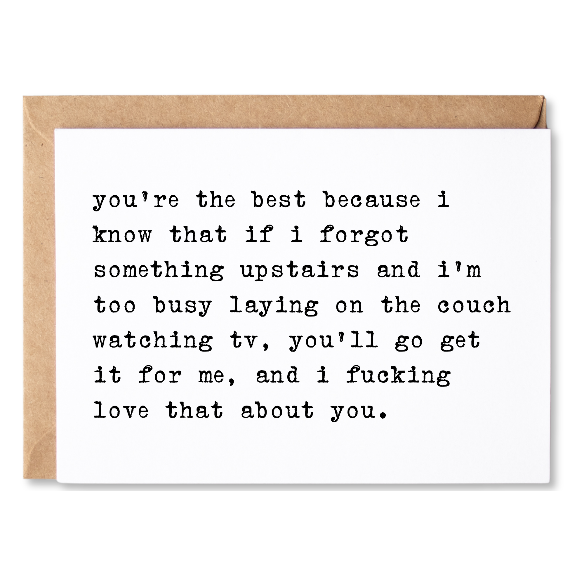 Card Text: you're the best because i know that if i forgot something upstairs and i'm too busy laying on the couch watching tv, you'll get get it for me, and i fucking love that about you.