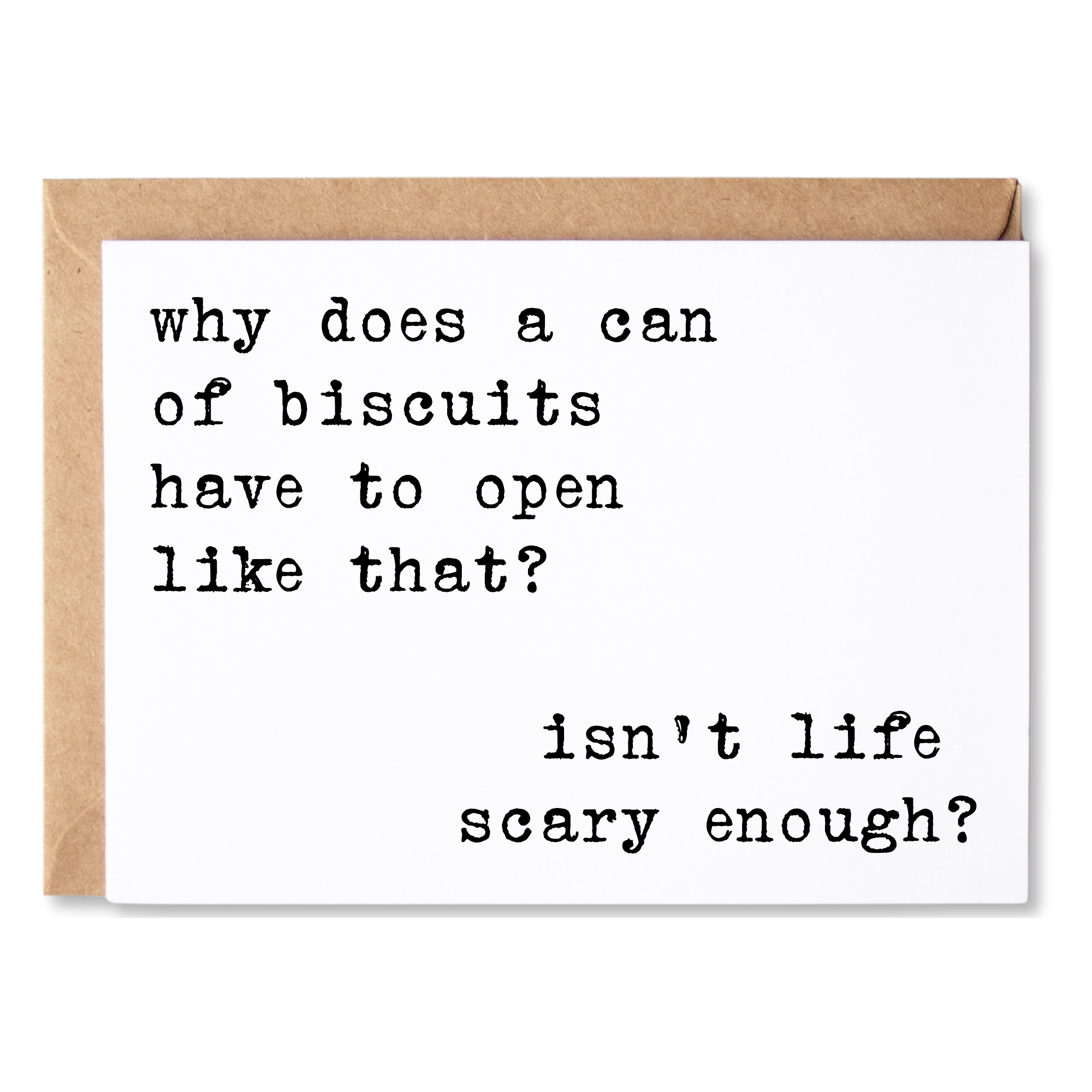 Card Text: why does a can of biscuits have to open like that? isn't life scary enough?